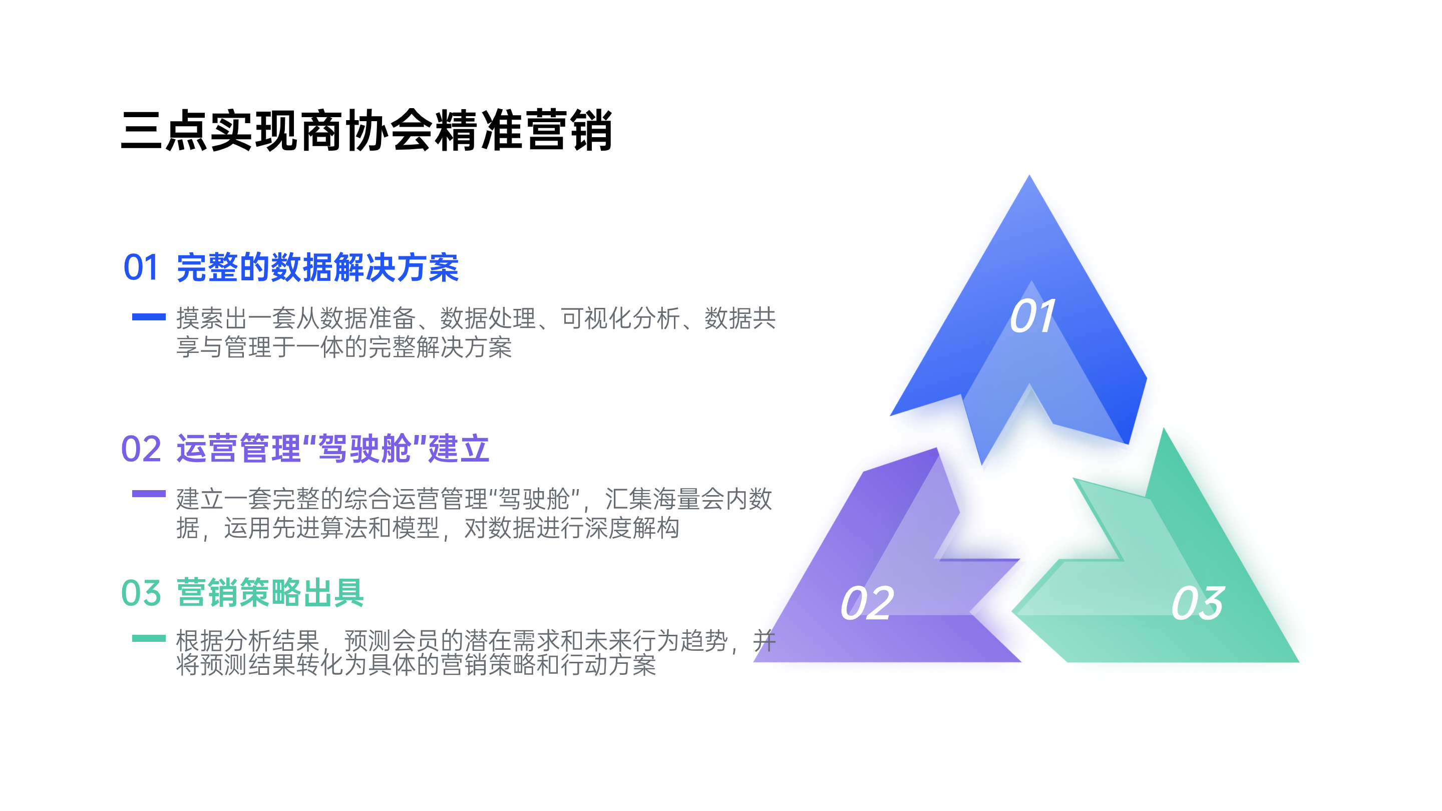 第一,摸索出一套从数据准备、数据处理、可视化分析、数据共享与管理于一体的完整解决方案;第二,建立一套完整的综合运营管理“驾驶舱”,汇集海量会内数据,运用先进算法和模型,对数据进行深度解构;第三;根据分析结果,预测会员的潜在需求和未来行为趋势,并将预测结果转化为具体的营销策略和行动方案。